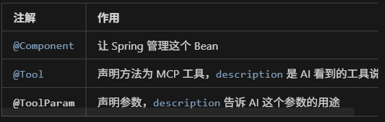 * @Tool 注解:声明这是一个 MCP 工具
