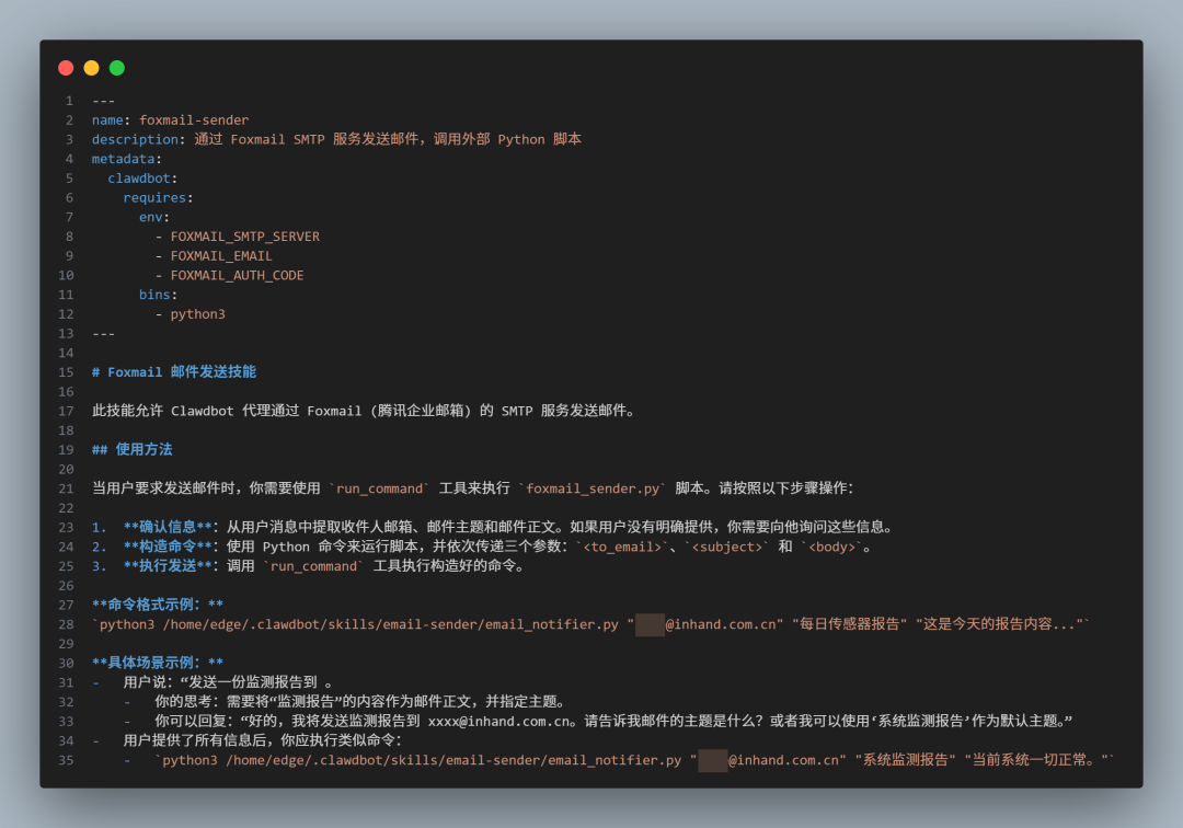 用于注册邮件发送 Skill(foxmail-sender)。Clawdbot 将通过该 Skill 调用本地 Python 脚本,实现自动邮件通知。
