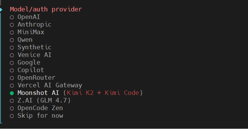 使用命令clawdbot onboard 按提示操作在Model/auth provider处配置好大模型提供商,如图: