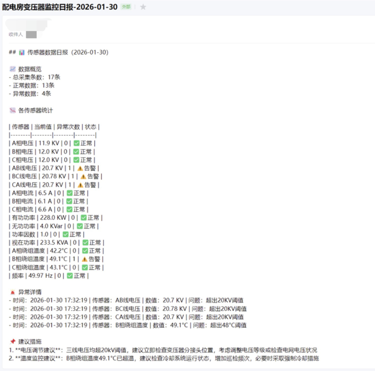定时采集变压器运行数据 → 实时分析 → 自动生成结果 → 邮件推送告警,实现自动化巡检与智能监控。