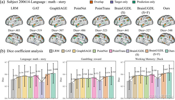 ②预测的脑激活重叠和Dice系数度量的多个阈值下表现: