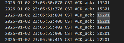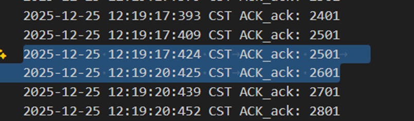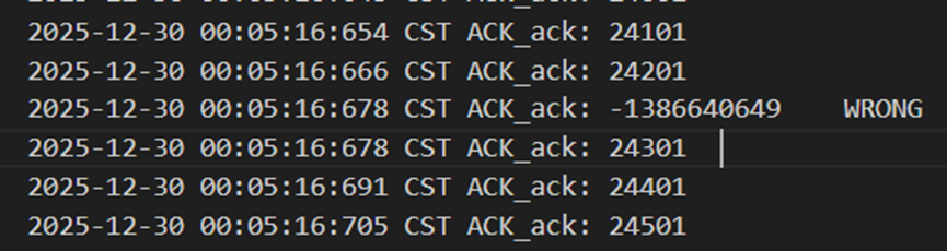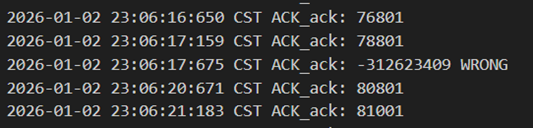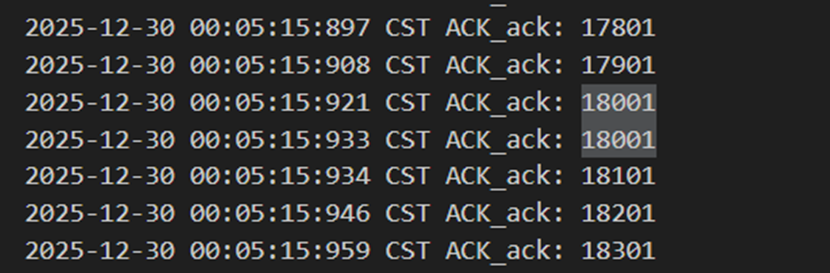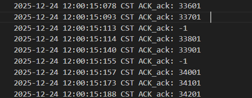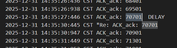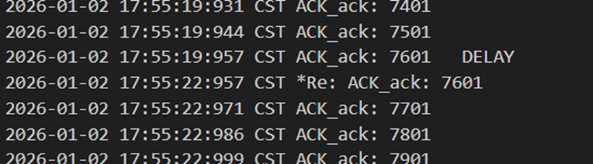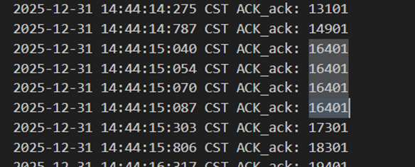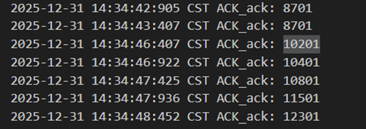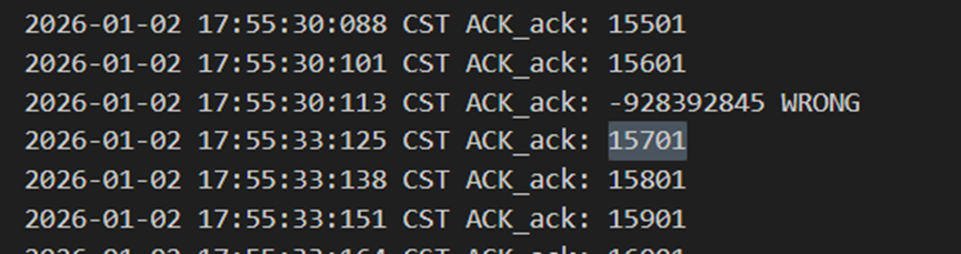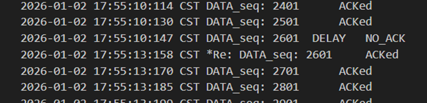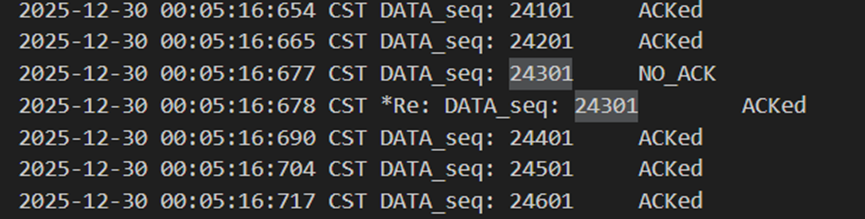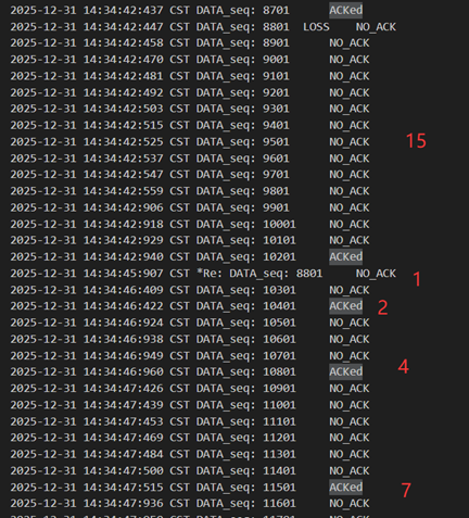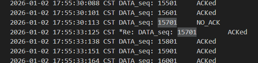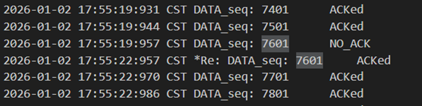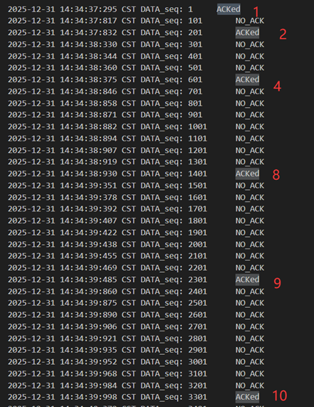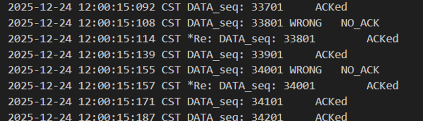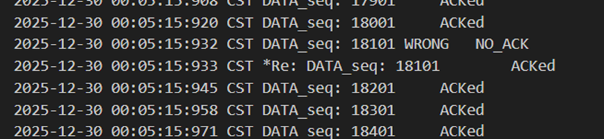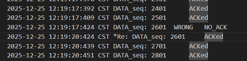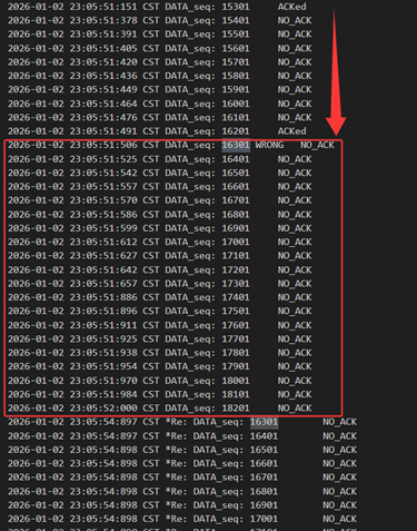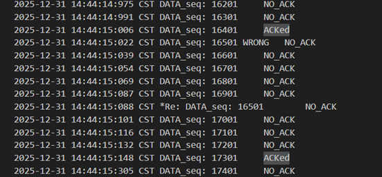 不难发现,当发送方发送正常包的时候,接收方也回复了同样序号的ack代表正确的确认。而当发送方发送错误包(如33801、34001)时,接收方会通过校验和判断收到的包出现了位错,回复序号为-1的NACK代表错误,也因此33801和34001在图9中显示的都是NO_ACK,发送方收到-1以后因为序号不一致,会进行重发(如图9的*Re指示),再次重传的包正确到达接收方以后,接收方会像正常情况一样发送对应序号的ack。