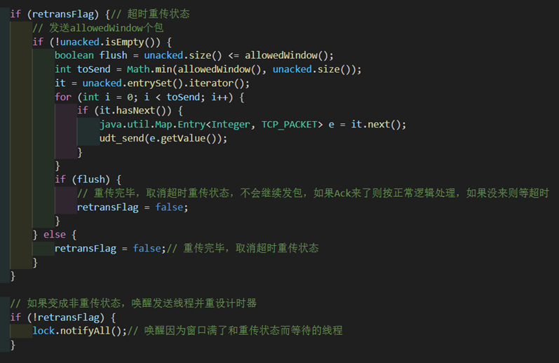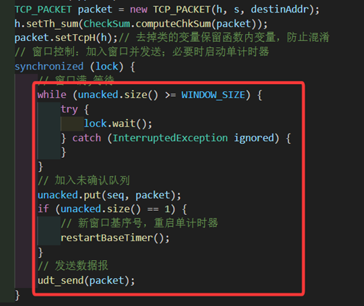 由于引入了一个超时重传标志retransFlag,并且窗口大小不再是固定的了,所以在发包函数中用来阻塞发送线程的条件需要更改。若窗口满或者在超时状态,就阻塞发送线程并进行等待。