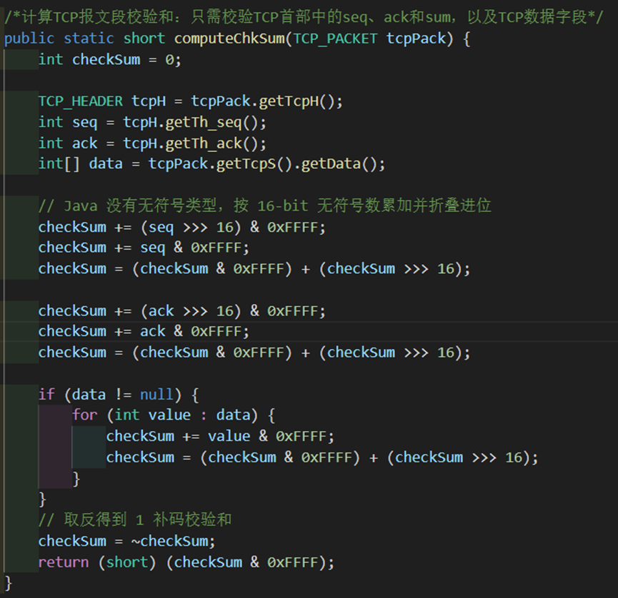 分析完基本流程以后就可以开始我们的代码编写了。首先我们需要完成computeChkSum函数实现校验和的计算。实验要求只需考虑seq、ack和数据字段。为了更好地模拟,我并没有用老师帮忙引入的CRC校验包,而是仍然仿照udp风格完成了校验码的设计(即将字段看成若干个16位的字,用二进制反码计算这些16位字的和,再取二进制反码)。