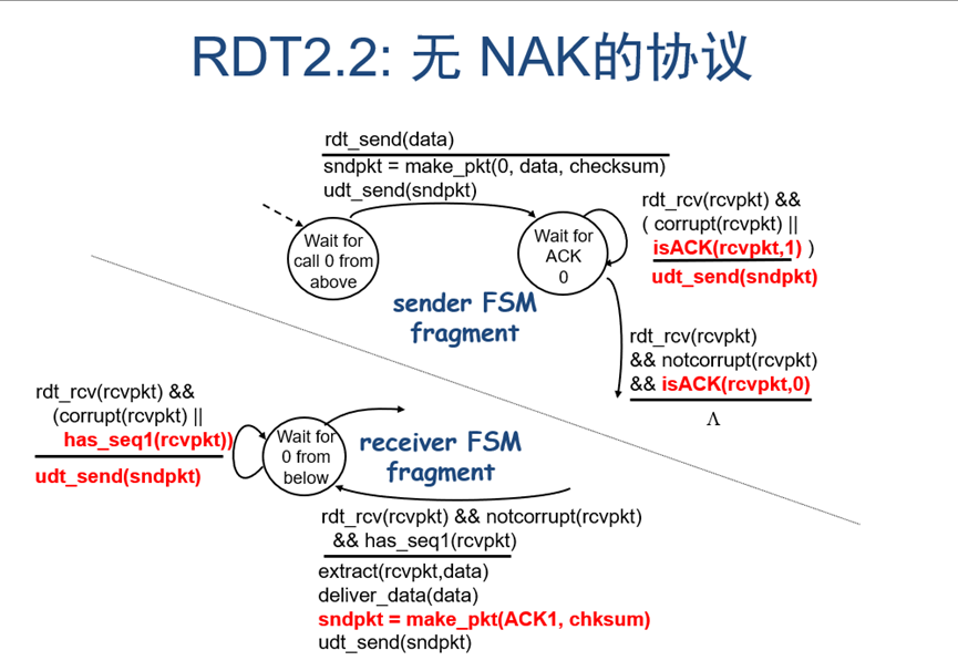 而rdt2.2则是在上述的基础上,将NAK改成重复的ACK包,这样子对发送方来说,和收到NACK的效果其实是一样的,发送方将会重发当前数据包。