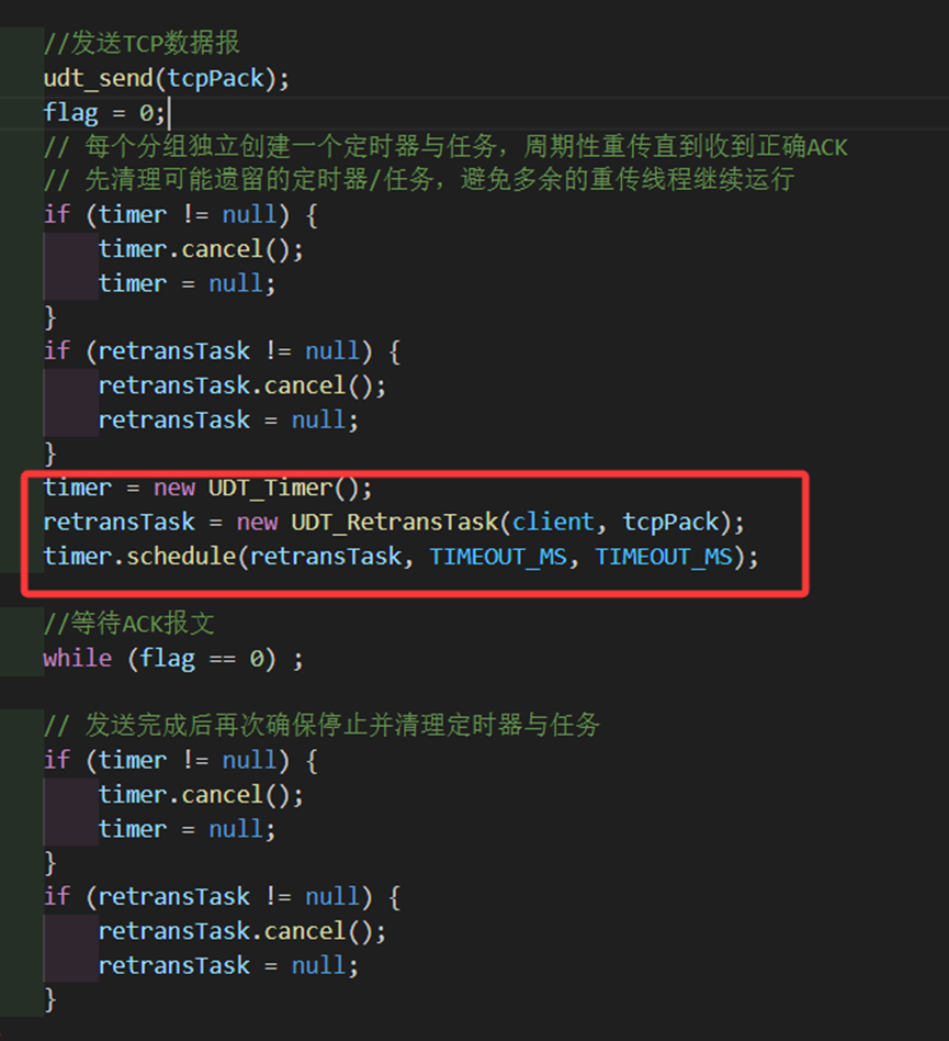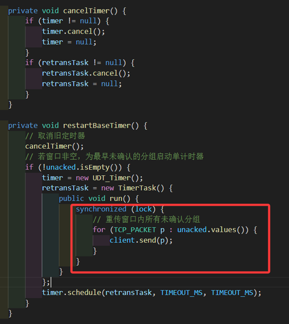 根据逻辑,我们需要在发包以后重设计时器,计时器的任务是等待3秒以后重传当前的包,并且之后每隔3秒都要进行一次。因此我们在发包前用cancel等代码确保之前的计时器停止了,再设立一个计时器。其中retransTask是调用接口重传发包的任务,timer是计时器,用来在3秒之后每隔3秒执行一次retransTask。