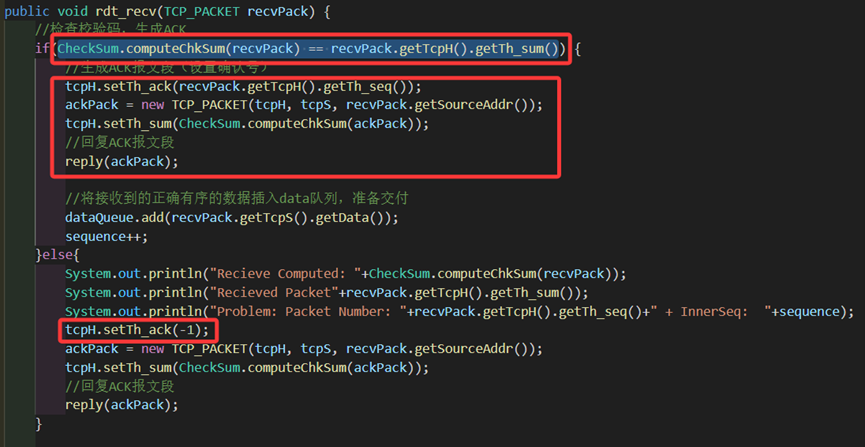 图 7 rdt_recv中校验和的实现和处理,以及如何产生ack和nack的序号