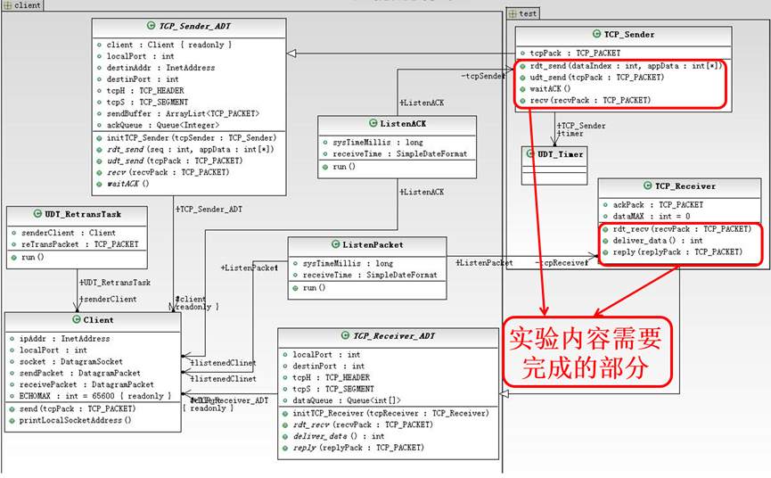 本次实验要在所给代码框架下,借助git工具实现迭代开发,最终要完成一个拥有拥塞控制的Reno版本的TCP协议。实验框架的UML图如下: