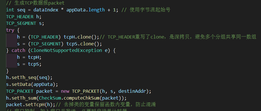1.发送端在发送数据包前,需要在tcpH(tcp报文头部)通过computeChkSum计算校验和,并用setTh_sum填入数据包报头中,其余字段如序列号、数据内容也有各自的set函数实现。创建一个TCP包并把包头、数据、目标地址填入,通过udt_send发包,随后利用flag=0进入等待。