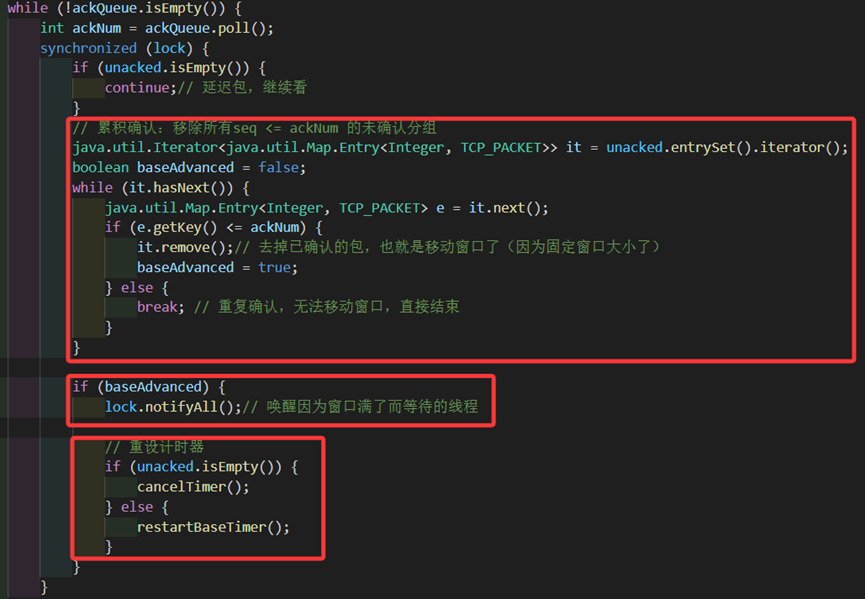 接下来则是和之前类似的确认包逻辑。这里需要用ackedCount记录下来确认了多少包,然后通过调用onAckIncrease(ackedCount)来实现窗口增长。随后也和之前一样正常的唤醒发送线程和重启计时器。