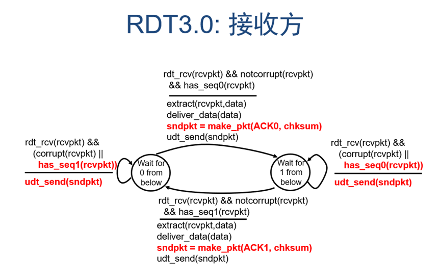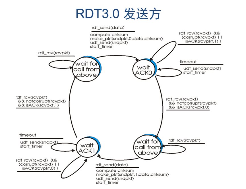 通过分析可知,rdt3.0中接收方和rdt2.2的其实完全一样,不需要做出任何改变。发送方则相比之前版本需要在发送包以后启动计时器用来检测是否超时,若超时则重发之前发出去的包。其余条件和rdt2.2一样。