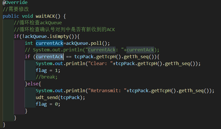 针对waitAck函数的改动很大。我们先对延迟包跳过的条件加强,防止对后续逻辑产生影响。(先前即使ackNum比窗口后延的未确认包序号小,也不会对后续逻辑产生影响,但这里有可能会有影响,所以需要加强)对于有位错的确认包依旧是直接抛弃不管。