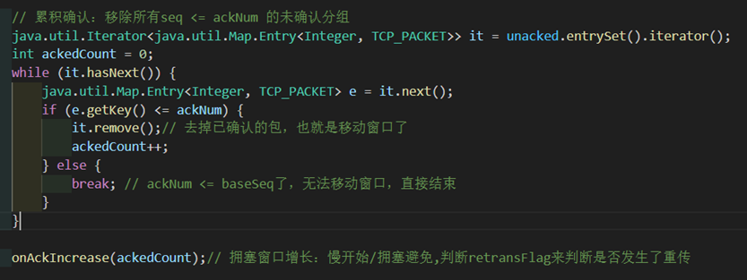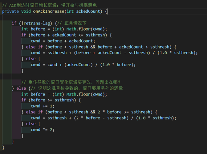 接下来是要新实现增窗口的慢开始、拥塞避免的函数。其参数ackedCount是在waitACK中记录下的本次移除了多少未确认分组的数量。