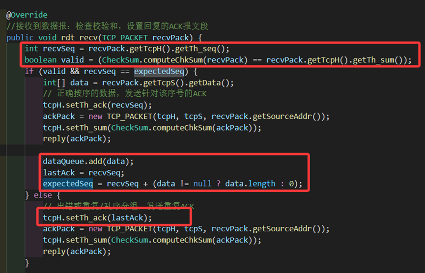若正确且符合期望,则正常地收包,让ack字段为当前包的seq代表确认,调用reply回复ACK。这里需要注意更新expectedSeq和lastAck,使得lastAck等于刚刚用来确认的期望序号,expectedSeq将自身加上当前收到的包的数据长度data.length来前移至下一个字节流号。