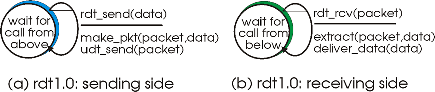 Rdt1.0版本认为所依赖的信道非常可靠,因此无需各种差错控制,发送方只需要一直发送并等待ack,接收方只要一直等待收包并发送ack。是最基本的传输模型。