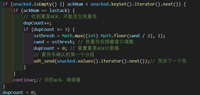 当收到的ack比窗口后延第一个包的seq还小,要判断是否是重复ack,如果是则用dupCount计数。(如果ack是比第一个包的seq大,则dupCount要清零)
