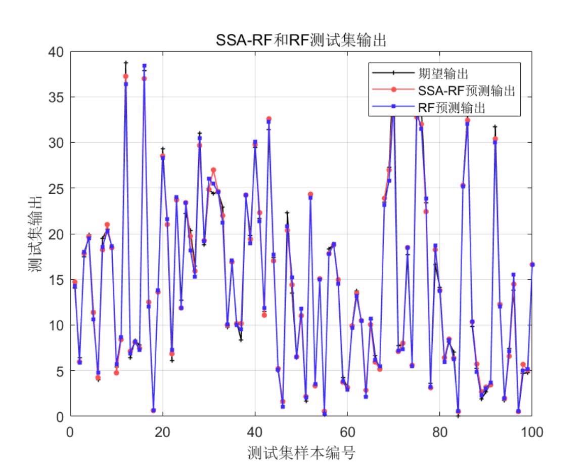 SSA-RF和RF神经网络多元回归预测(Matlab) 所有程序经过验证,保证可以运行。 2.输入2个特征,输出1个,即多输入单输出; 3.运行环境Matlab2018及以上,运行主程序MainSSARF_RF即可,其余为函数文件无需运行,所有程序放在一个文件夹,data为数据集; 4.命令窗口输出优化前后的MSE和最优参数,包括树木大小和叶子节点数; 5.预测效果如下: