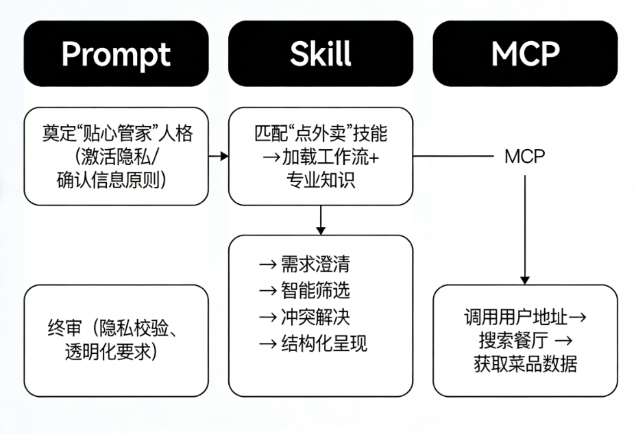 我们以千问的点外卖功能为例,演绎Skill、MCP与Prompt如何精密配合,完成这项看似简单实则复杂的任务。