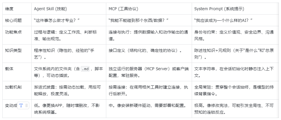 要理解 Agent Skill 的革命性,必须首先将其从两个最常见的认知泥潭中剥离出来:与 MCP的混淆,以及与提示词的混淆。这三者并非相互替代,而是构成现代智能体(Agent)的三大支柱,各司其职,缺一不可。