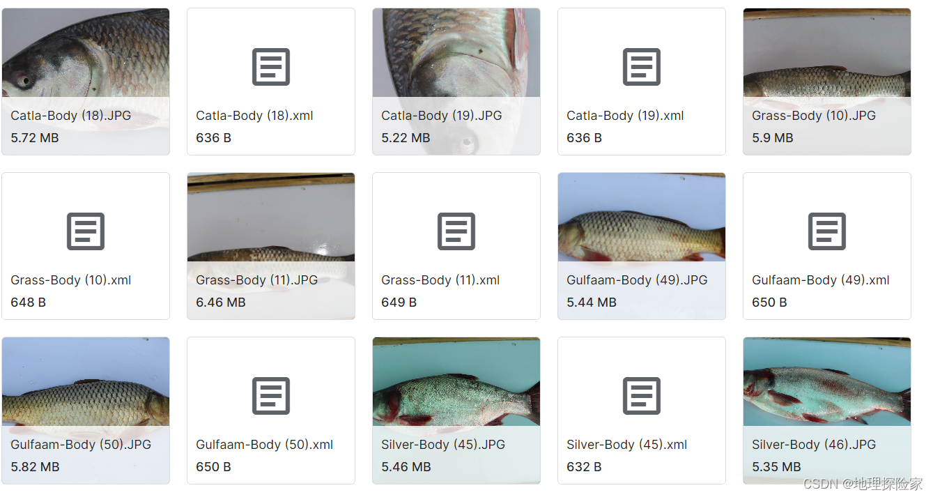 - 鱼类检测数据集数据说明:包含 Catla、Silver、Gulfaam、Grass 4 种鱼类,配套 XML 标注文件,共 254 张图片,标注格式适配 PascalVOC 标准。适用场景:入门级鱼类检测模型训练、小型水域鱼类种类统计。