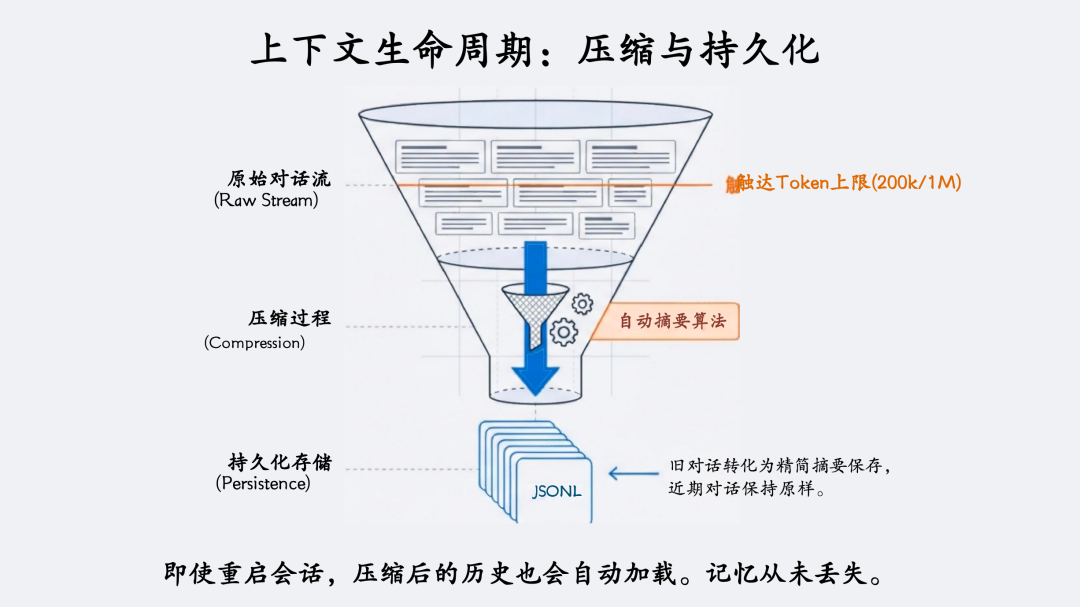 当对话逼近上下文上限,Clawdbot 不会简单截断,而是将旧对话“打包压缩”成摘要。为了防止压缩导致关键信息丢失,它会在压缩前执行“记忆刷新”——强制 AI 回顾一遍核心指令,确保压缩后的摘要依然保留了你的“灵魂”。