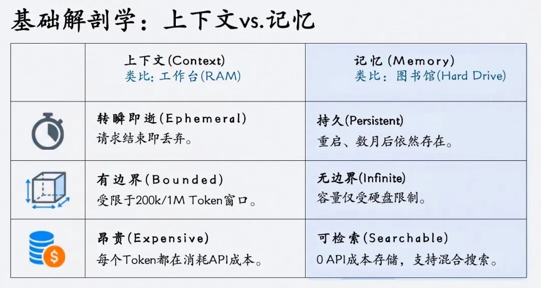 大多数 AI 助手只活在“上下文”里。上下文是你当前的聊天记录、系统提示词和附件。它是昂贵且有限的——即使是 GPT-5.1 或 Claude 的超长窗口,每个 Token 都在烧钱,且一旦重置即焚。