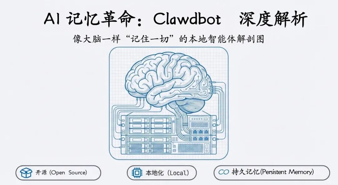但 2026 年初爆火的开源项目 Clawdbot,正在改写这个规则。它不需要昂贵的云端数据库,也不受科技巨头的隐私辖制,直接在你本地电脑上,用一种极客又优雅的方式,构建了一个能“记住一切”的 AI 伙伴。