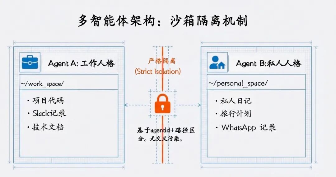 它支持多智能体(Multi-Agent)模式。你可以在 <font style="color:rgb(68, 71, 70);">~/work/</font> 目录下养一个严谨的“代码助手”,在 <font style="color:rgb(68, 71, 70);">~/life/</font> 目录下养一个随性的“聊天搭子”。