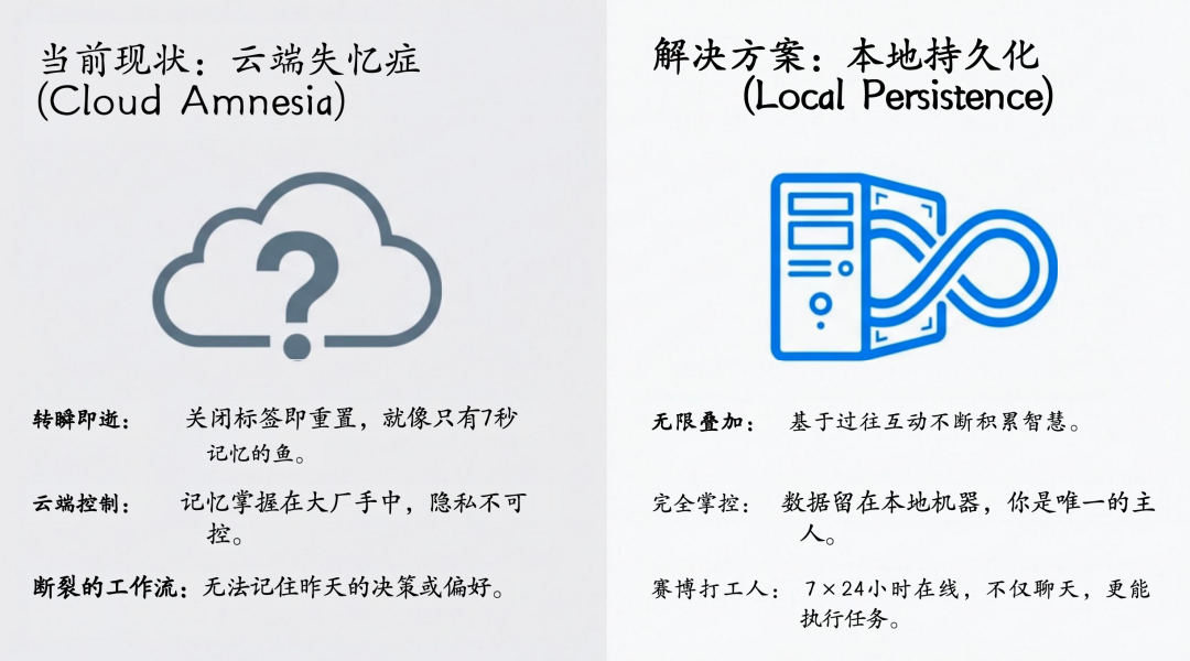这就是云端大模型的通病——它们只有短暂的“上下文”,没有真正的“记忆”。