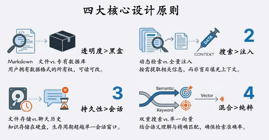 它的“记忆”不占用宝贵的上下文窗口,而是作为静态文件躺在你的硬盘里(Markdown 格式)。这带来了三个绝对优势: