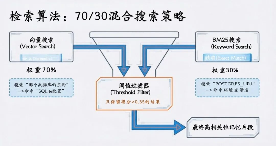 Clawdbot 摒弃了单一的向量搜索,采用了一套混合检索策略(Hybrid Search):