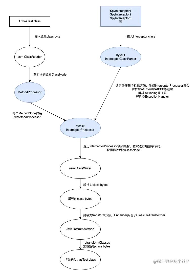 当JVM加载类时会将类文件的字节数组传递给ClassFileTransformer的transform方法,在transform方法中对Class文件进行解析和修改,之后JVM就会加载转换后的Class文件