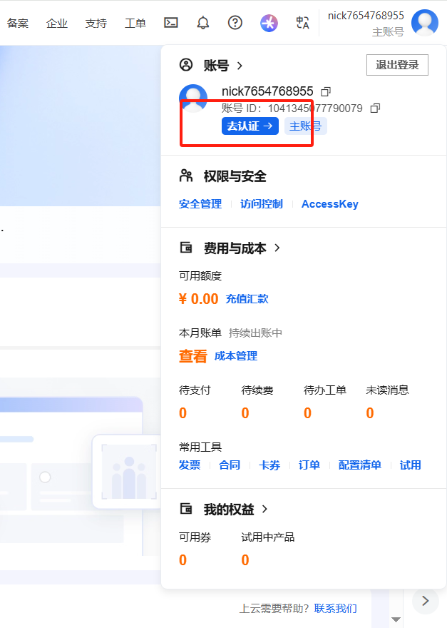 若你已有阿里云账号且完成实名认证,可直接跳过本节,进入1.2节;若未注册或未完成实名认证,需先完成注册和认证,否则无法领取免费ECS服务器权益。