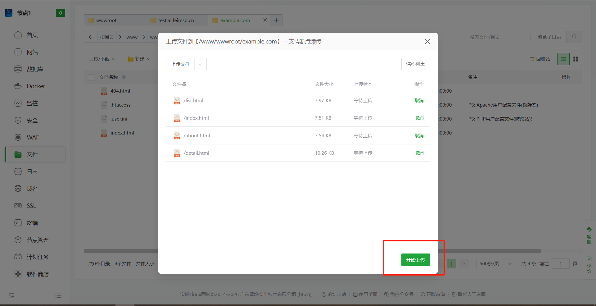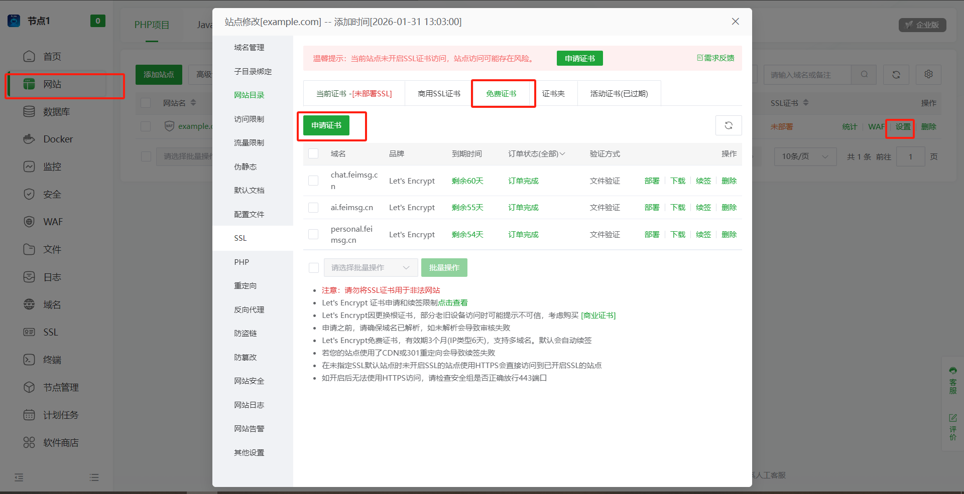 宝塔面板集成了Let’s Encrypt证书的申请和配置功能,无需手动操作复杂的命令,一键即可完成申请、安装和配置,同时支持自动续期,避免证书过期后网站无法访问。