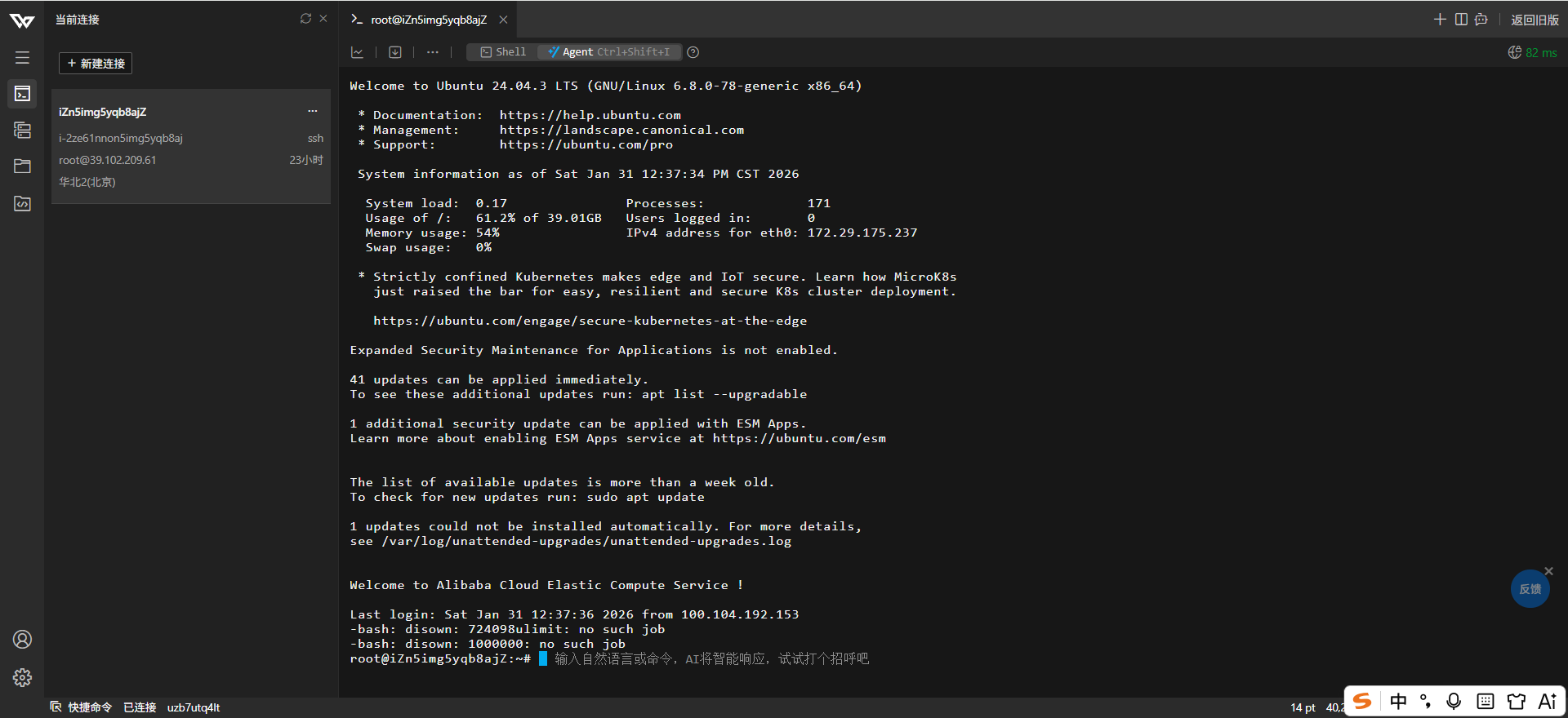 我们可以通过阿里云Workbench远程连接服务快速连接至ssh