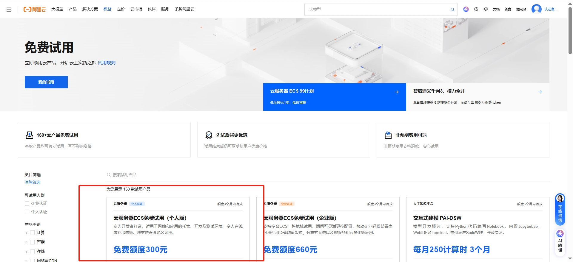 步骤1:进入阿里云权益中心,点击导航栏的“我的权益”或“免费试用”,找到“云服务器ECS免费试用(个人版)”对应的“立即试用”按钮,点击进入领取页面。