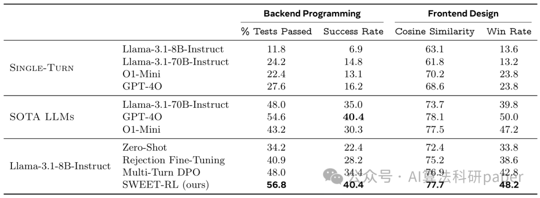 方法:论文为提升大模型智能体多轮协作能力,建了ColBench基准(含编程、设计场景),提了SWEET-RL算法——让智能体借训练时额外信息练优势函数、再优化策略,解决传统RL问题,使Llama-3.1-8B性能升6%,比肩GPT-4o。