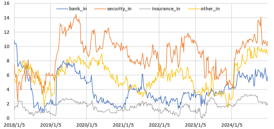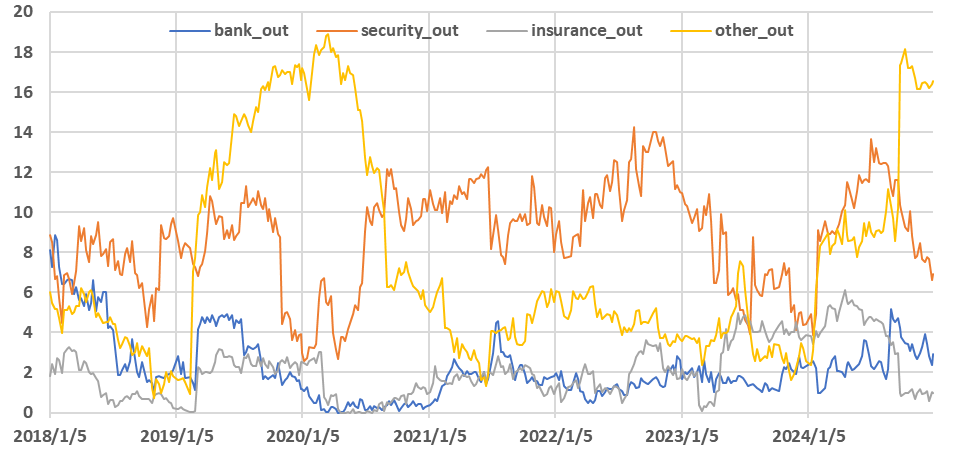 在风险溢出端,早期其他类机构(other_out)溢出度冲高明显,后续证券业(security_out)逐渐成为风险溢出主力,波动加剧且峰值接近 20,银行业(bank_out)溢出度始终较低,保险业(insurance_out)同样维持低位。
