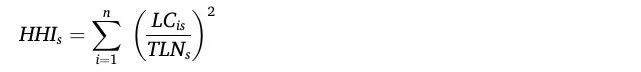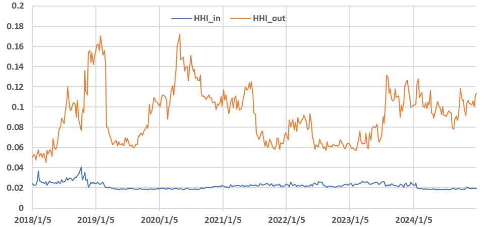 HHI 的计算如下公式所示,其中 LCis 表示节点 i 的连接边数量,TLNs 表示窗口 s 下网络的连接边总数。