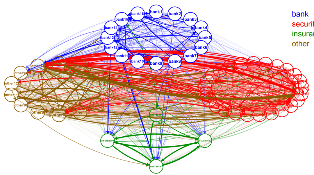 下图展示了四类金融机构的总体关联网络。可以发现,银行与证券作为金融机构风险关联网络的核心枢纽,两者共同构成网络的风险传导主轴;其他类机构作为次活跃关联方,内部存在一定关联且与核心枢纽建立常态化风险链接,但关联密度低于银行与证券;保险机构则处于网络边缘,仅存在少量内部及与银行的弱关联,风险关联参与度显著较低。