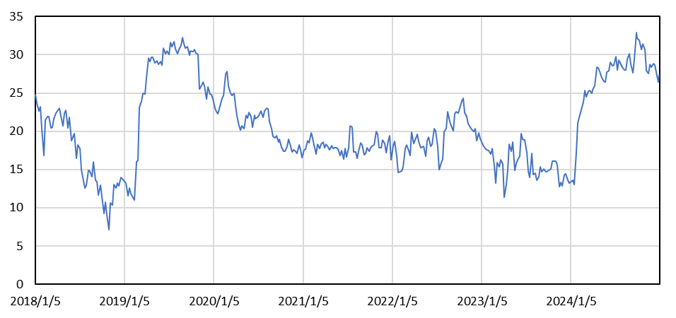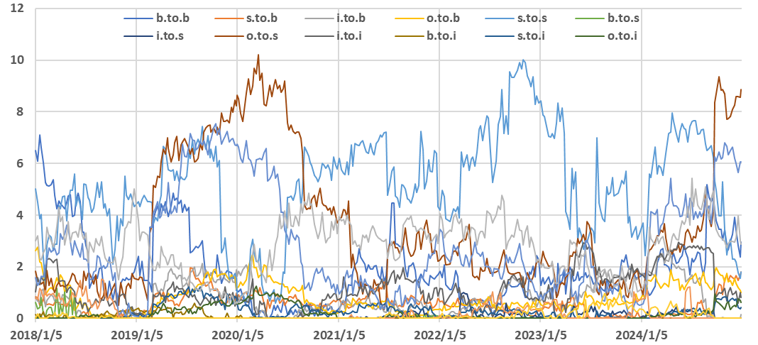 下图展示金融系统总体关联性在2018年1月至2024年12月期间的动态演化结果。2018 年 1 月至 2024 年期间,金融系统总体关联性呈现明显的阶段性波动:2018 年初以 25 左右起步后,年内波动下行至接近 10 的低位,反映当时中美贸易摩擦冲击下金融主体联动性阶段性变化;2019 年初快速冲高至 30 以上高位,意味着金融系统内各部分关联度大幅提升,风险传导链路更密集;2020-2023 年维持在 15-20 的中高位区间波动,体现这一阶段关联性活跃且相对稳定;2024 年再度攀升至 30 以上高位后小幅回落,显示金融主体联动重回高活跃水平。整体而言,走势与贸易摩擦、疫情、政策调整等外部因素关联紧密,关联性高低对应着金融系统风险传导效率的动态变化。