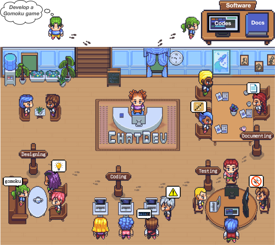 ChatDev 借鉴软件工程瀑布模型(Waterfall Model)的思想,将其分为 软件设计(Designing)、系统开发(Coding)、集成测试(Testing)、文档编制(Documenting) 四个主要环节。