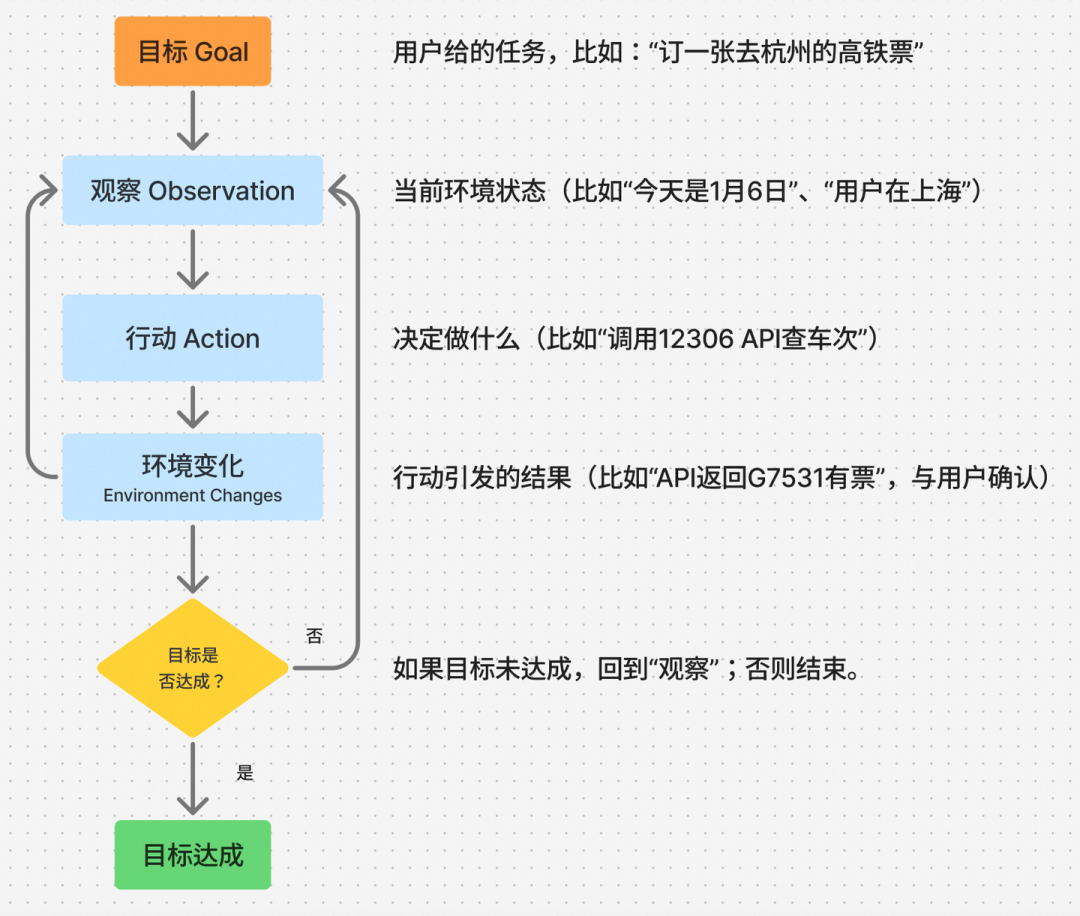 这个“目标 → 观察 → 行动 → 环境变化 → 循环”的闭环,就是 Agent 的核心运行逻辑。