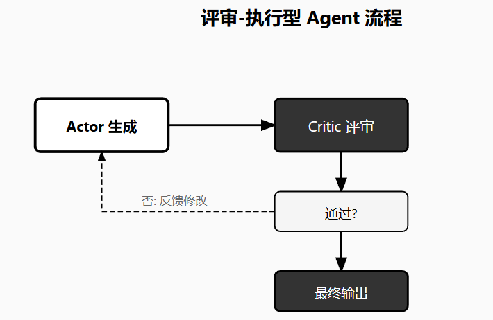 和反思型 Agent 的自我检查不同,评审-执行型是两个独立的 Agent。Actor 只管生成,不管质量判断。Critic 只管评审,不管生成。这种分离让各自更专注,评审标准也更客观。