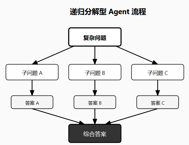 遇到复杂问题时,这类 Agent 会先把大问题拆成小问题,解决完小问题后再综合回答大问题。核心是问题的层层分解和自底向上的答案汇总。