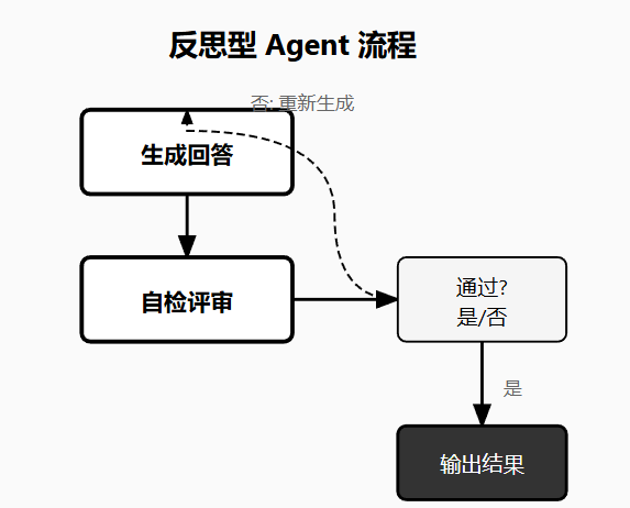 普通的 Agent 生成完答案就直接返回了,对错全靠模型一次性输出的质量。反思型 Agent 多了一个自检环节,生成答案后调用一个评审模块检查答案是否有逻辑漏洞、事实错误或与用户需求不符。如果发现问题,Agent 重新生成答案,循环直到通过检查。