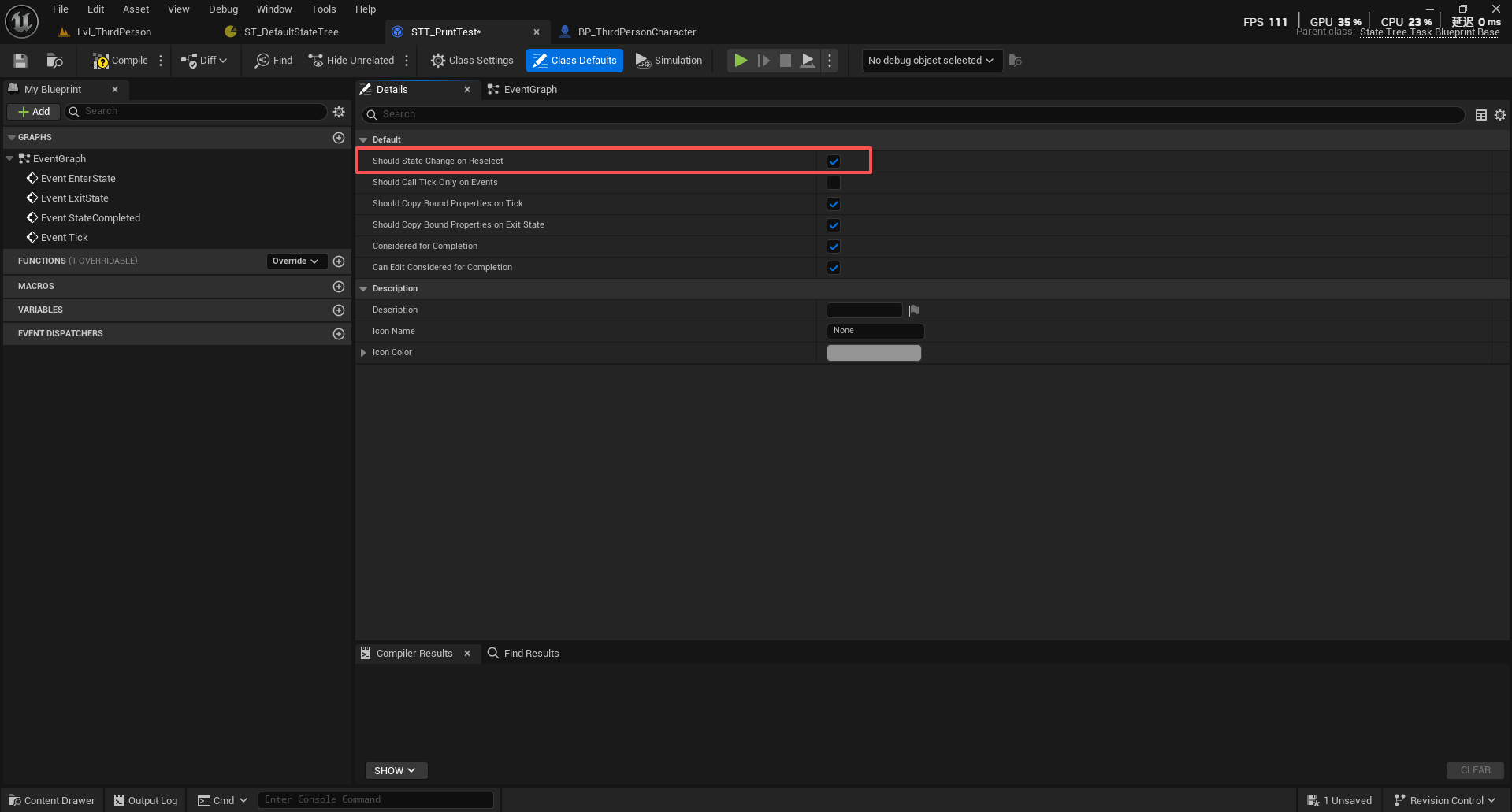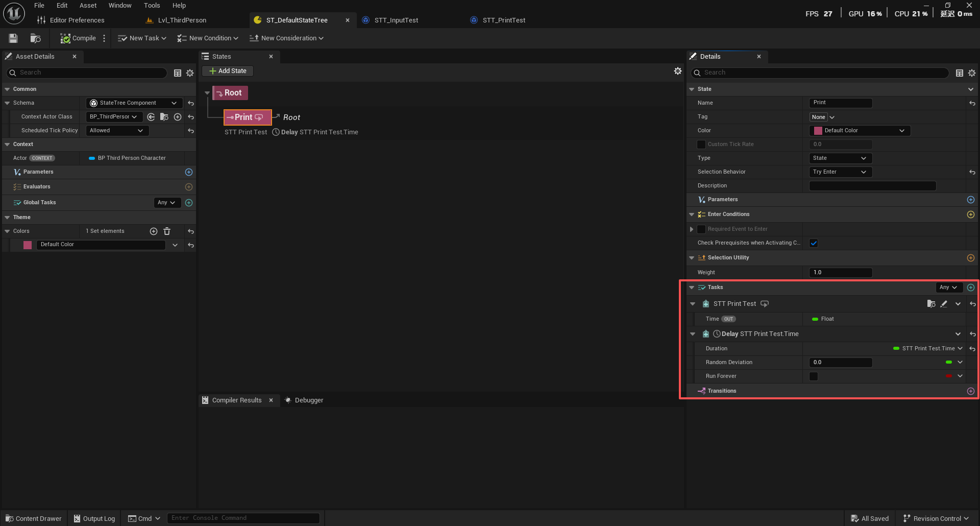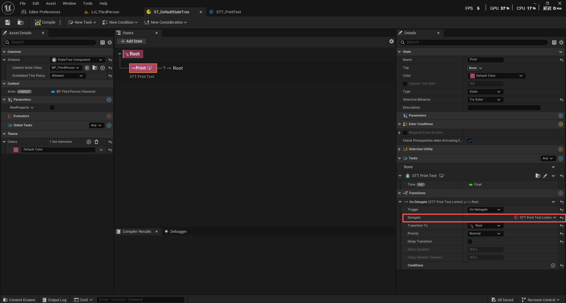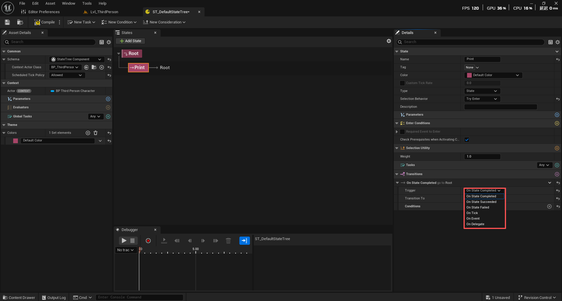 EnterState()->Tick()->TriggerTransitions()(转换触发时调用,若启用的话)->状态完成->StateCompleted()(反向顺序的状态完成时调用)->ExitState()(退出状态时调用)