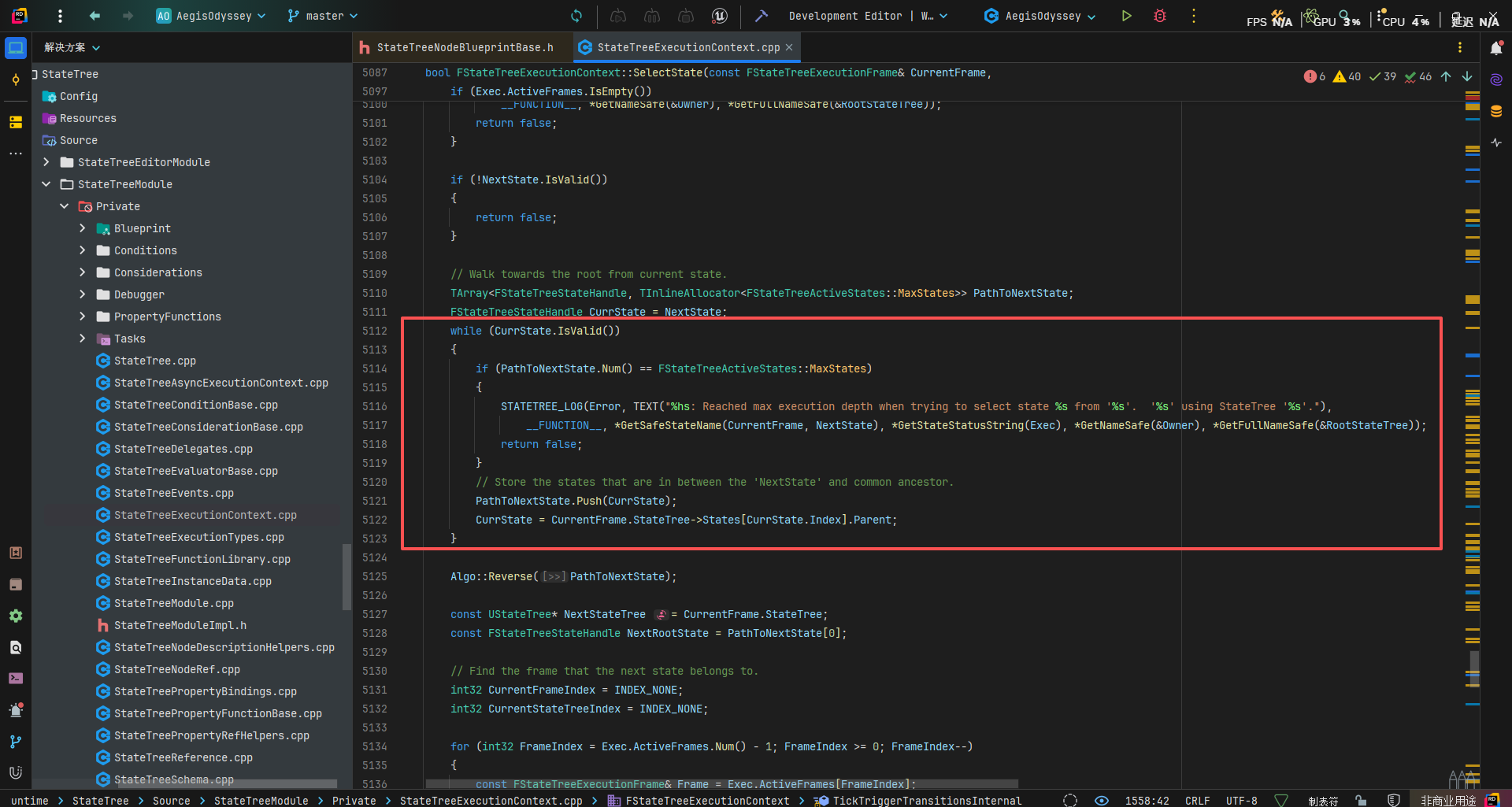 接下来要做一种情况,就是查找共同帧,帧对于状态树来说是用于记录正在执行的状态树资产和活动状态,是状态树执行环境的匹配检查,有一种情况,如果某个或某些状态链接了其他的状态树资产,此时当前状态树A属于活动帧A,链接的状态树B属于活动帧B,那么在查找共同帧的时候,会检查目标状态是否属于当前活动帧的状态树然后尝试匹配