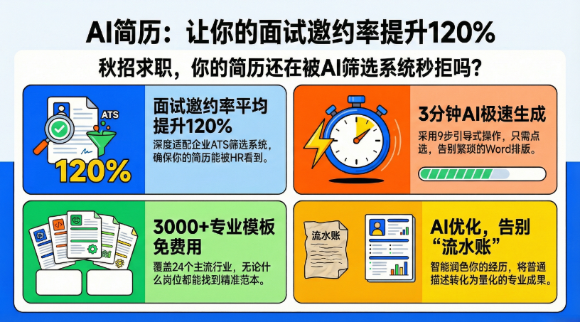 2026届的秋招求职季已经拉开帷幕。当下的求职市场已经进入了“AI双向筛选”的时代。HR端正在利用AI工具进行简历初筛,而许多求职者却还在纠结格式排版,把大量宝贵的时间浪费在反复修改Word文档上。你必须意识到,如果你的简历无法触发机器识别的“得分点”,你大概率连HR的面都见不到。