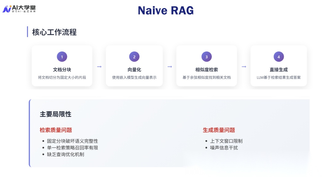 Naive RAG 就像一个被动的“知识搬运工”,它只能机械地执行预设的流程,缺乏对信息质量的判断和对查询意图的深度理解。